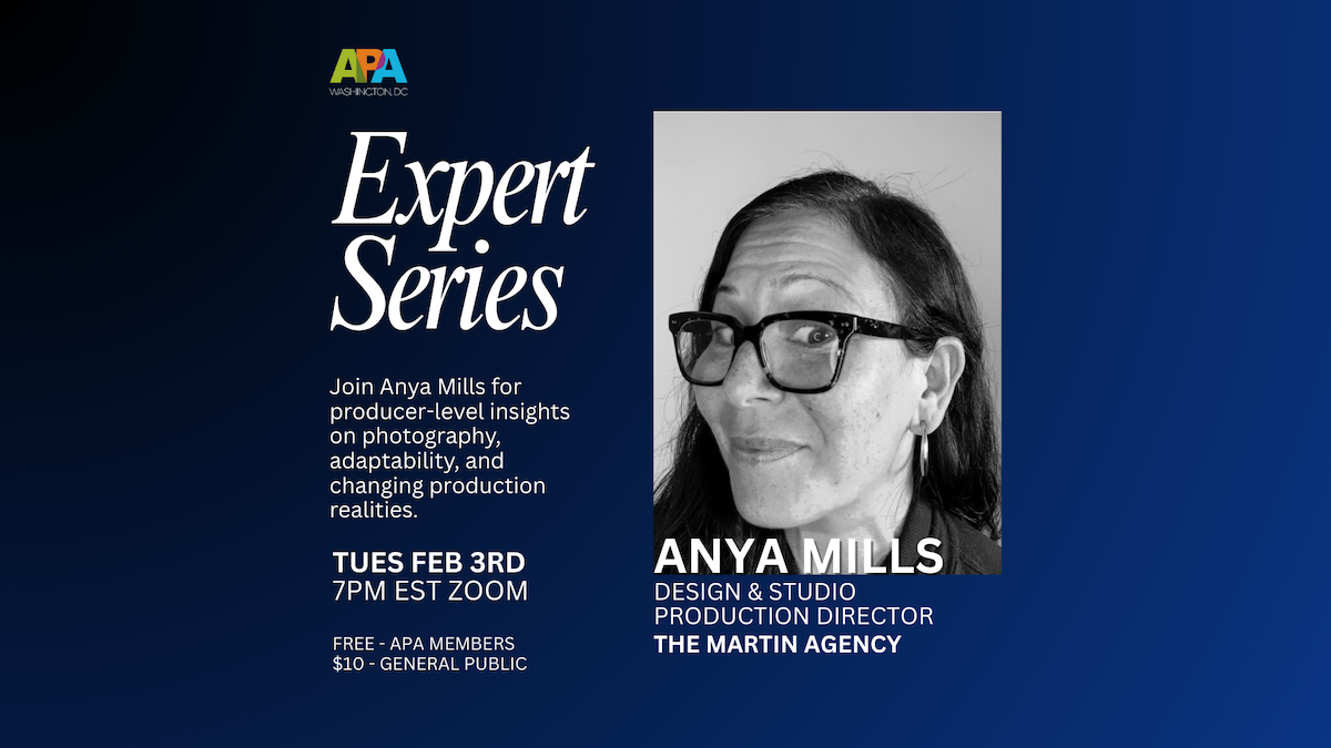 Join APA|DC on Tuesday, February 3rd at 7pm EST on Zoom for the next addition of our Expert Series with Design & Studio Production Director Anya Mills of The Martin Agency. Learn how Anya draws on decades of experience in design, production and creative collaboration to bring culture defining work to life across major brands and campaigns. Free for all APA members; membership will be verified. $10 for General Public + fees.